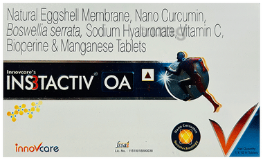 Ins3tactiv OA Tablet: Ins3tactiv OA Tablet is a dietary supplement designed to help support joint health, manage inflammation, and aid in bone and cartilage maintenance. This blend includes ingredients such as Natural Eggshell Membrane, Nano Curcumin, Boswellia serrata, and Sodium Hyaluronate, which may help relieve joint stiffness, manage pain, and support cartilage integrity. With Vitamin C, Bioperine, and Manganese, it offers antioxidant defense and can help improve nutrient absorption, and essential trace minerals to help support bone strength and joint function. It is ideal for individuals experiencing joint pain, stiffness, or inflammation. Ins3tactiv OA Tablet provides a holistic approach to joint care, which can help provide comfort, mobility, and support an active lifestyle. Key Ingredients: Natural Eggshell Membrane 65% 250 mg, Nano Curcumin 250 mg, Boswellia serrata (Boswellic acid 65%) 250 mg, Sodium Hyaluronate 45 mg, Vitamin C 35 mg, Bioperine 5 mg, Manganese (Elemental) 2.5 mg, Other Ingredients: Anticaking agent (INS 551, INS 553), Preservative (INS 211), Surface active agent (INS 487), Lubricant (INS 470()), Carrier (INS 462), Stabilizer (INS 468), Bulking agent (INS 1403, INS 460 ()), Binding agent (INS 1201 and INS 1202), contains permitted synthetic food colours (INS 171 and INS 133) Key Benefits: