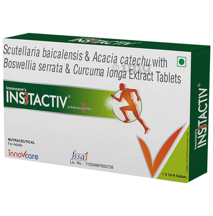Ins3tactiv Tablet is a vegetarian dietary supplement formulated to help support joint health and relieve discomfort, inflammation, and swelling. It contains a blend of herbal extracts, including Univestin (Scutellaria baicalensis and Acacia catechu), Boswellia serrata, and micronized Curcuma longa that offer anti-inflammatory properties, and may help support cartilage integrity and contribute to smoother joint movement.