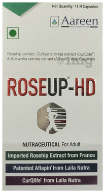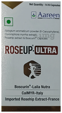 Curcuma longa (Curcumin 95%) 250 mg, Boswellia serrata Extract 50% 125 mg, Commiphora myrrha 125 mg, Rosehip Extract 750 mg, Ginger Extract 40 mg, Bioperine 5 mg, Other Ingredients: Microcrystalline Cellulose [INS.460(i)], Sodium Starch Glycolate, Polyvinylpyrrolidone [INS. 1201], Talc. [INS.553()], Ethyl Cellulose [INS.462], Magnesium Stearate [INS.470(iii)], Croscarmellose Sodium [INS.466], Silicon Dioxide [INS.551], Methyl Paraben [INS 218], Synthetic Food Colour (INS.171, INS.172 (ii))