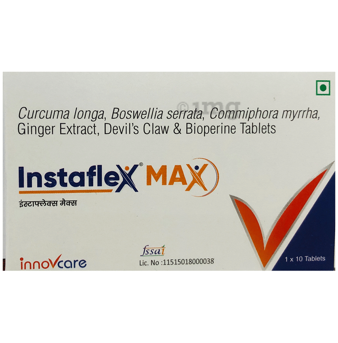 Instaflex Max Tablet is a comprehensive joint health supplement formulated with a potent blend of plant-based ingredients with their anti-inflammatory and pain-relieving properties. Enriched with Curcuma longa (Curcumin 95%), Boswellia serrata, Commiphora myrrha, and Devil’s Claw Extract, it can help alleviate joint stiffness, swelling, and discomfort associated with everyday wear and tear or age-related conditions. Ginger Extract contributes additional anti-inflammatory support, while Bioperine may ensure absorption of active components, helping amplify their effectiveness. Crafted for those seeking natural support for joint comfort, flexibility, and mobility, Instaflex Max is a vegetarian supplement ideal for daily use.