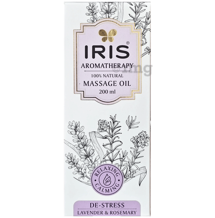 Iris Aromatherapy De-Stress Massage Oil is crafted with a unique blend of natural essential oils, including Rosemary, Lavender, and Lemon. This combination can help relieve fatigue, headaches, and stress. Enriched with natural oils from Pomegranate seeds, Evening primrose, Almonds, and Olives, it can help provide a smooth and relaxing massage experience.
