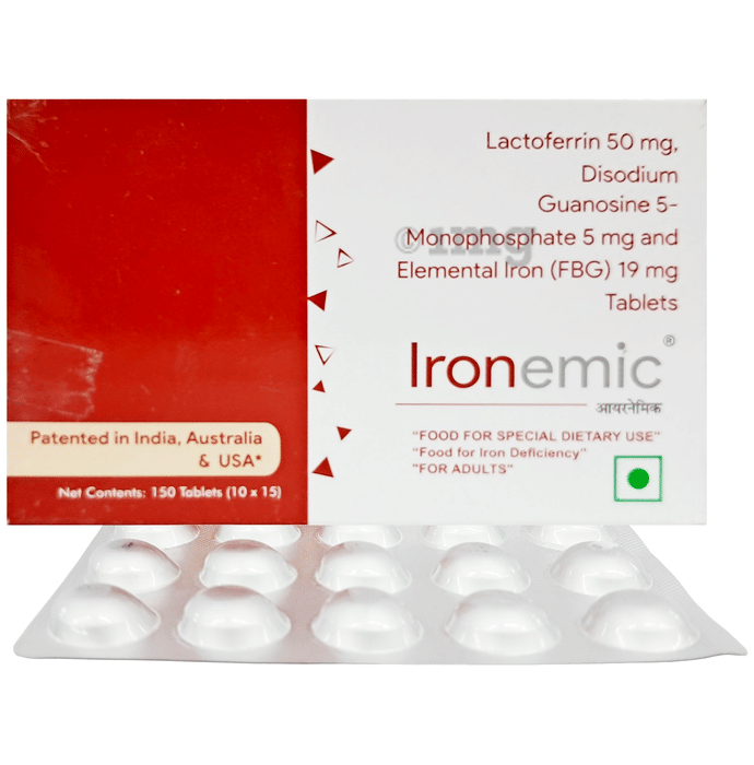 Ironemic Tablet is an iron deficiency supplement that helps boost and maintain the iron levels in the body. Iron is an essential mineral for the body, mainly found in muscle and red blood cells. It helps the red blood cells transport oxygen from the lungs to the cells, can be especially useful for preventing anaemia, and may also aid in managing other ailments like fatigue, ADHD, child development etc.