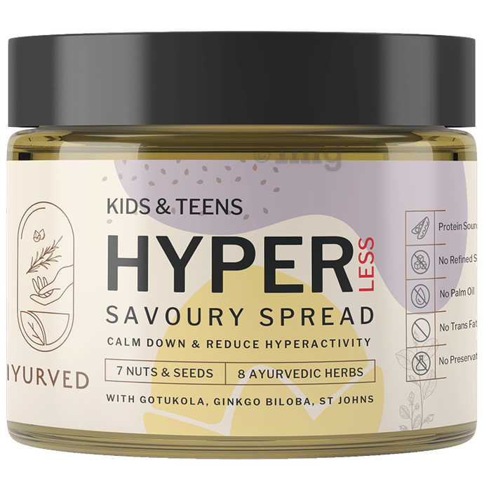 Iyurved Kids & Teens Hyper Less Savoury Spread is formulated with 18 nutrient-rich ingredients, which provide daily nutrition for kids and teens to help with hyperactivity. It contains ayurvedic herbs, nuts, and seeds like gotukola, ginkgo biloba, and st johns to provide daily nutrition to the child.