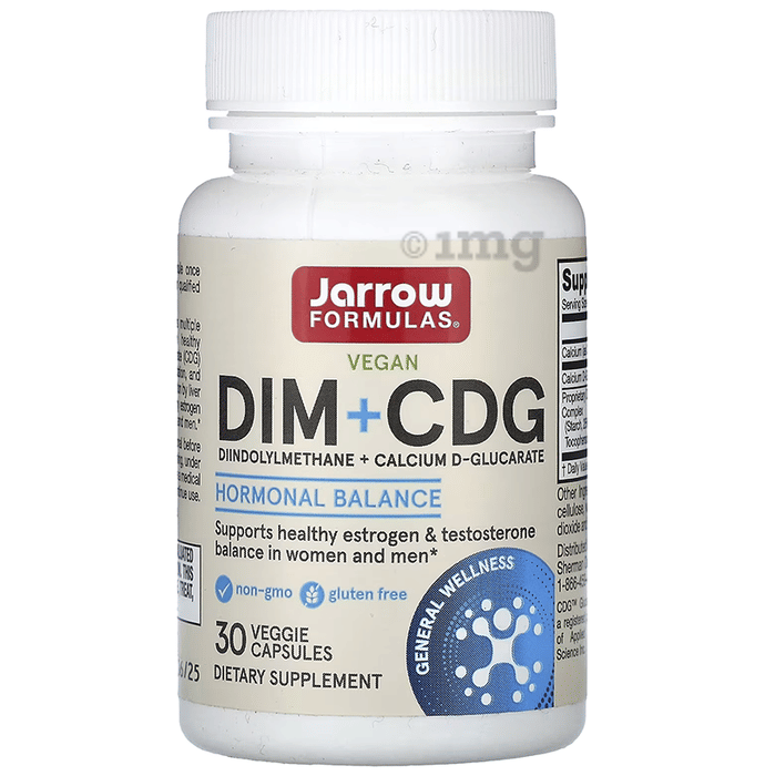Jarrow Formulas DIM + CDG Veggie Capsule Jarrow Formulas DIM + CDG Veggie Capsule helps supports oestrogen balance and healthy cell replication. DIM + CDG supports multiple detoxification pathways involved in healthy hormonal regulation. Calcium D- glucarate (CDG) supports glucuronidation, an important detoxification pathway. Diindolylmethane (DIM) supports detoxification by liver 2-hydroxylation. DIM+CDG supports healthy estrogen and testosterone balance in both women and men.