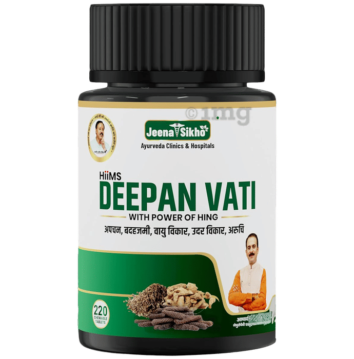 Jeena Sikho Hiims Deepan Vati is an Ayurvedic formulation prepared with Hing (Ferula foetida), Sonth, Kali Mirch, Jeera, and other carefully measured ingredients. It can help support digestive comfort and contribute to the management of common gastrointestinal concerns. The formulation may support appetite regulation, improve assimilation of food, and offer relief in conditions related to heaviness and bloating. By bringing together herbs, salts, and minerals, this tablet is designed to support overall digestive balance in a natural and holistic way.