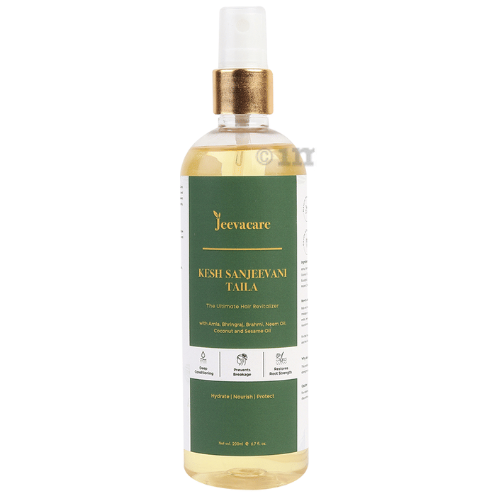 Jeevacare Kesh Sanjeevani Taila is a hair revitalising oil crafted with a unique blend of 17 natural oils and Ayurvedic herbs. It contains ingredients like Amla, Brahmi, Bhringraj, and Neem Oil that can help condition the scalp and nourish the roots. This formula can help manage breakage, restore strength to the hair shaft, and hydrate the scalp.