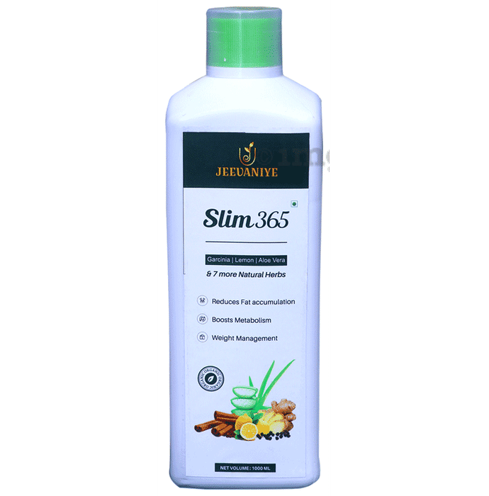 Jeevaniye Slim 365 is a powerful combination of all-natural ingredients. It includes triphala, garcinia, lemon, green tea, aloe vera, ginger, cinnamon, trikut, black pepper. This formulation helps cut down fat accumulation in the body. This formula helps maintain healthy body weight and helps boost metabolism. It is effective for reducing excess cravings and helps keep the body stay lean, slim, and healthy.