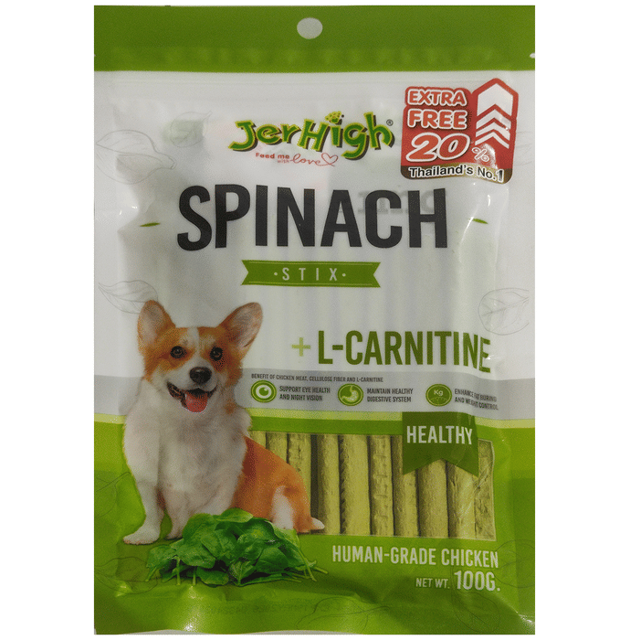 JerHigh L-Carnitine Stix Spinach is a soft, chewable treat crafted with real chicken meat and flavoured with spinach. The inclusion of L-carnitine may help support fat metabolism, while inulin assists in maintaining digestive regularity. With vitamin A to support visual function and a satisfying taste profile, this treat is suitable for daily use or as a reward. Its stick form offers ease of feeding and is ideal for dogs of all breeds and life stages.