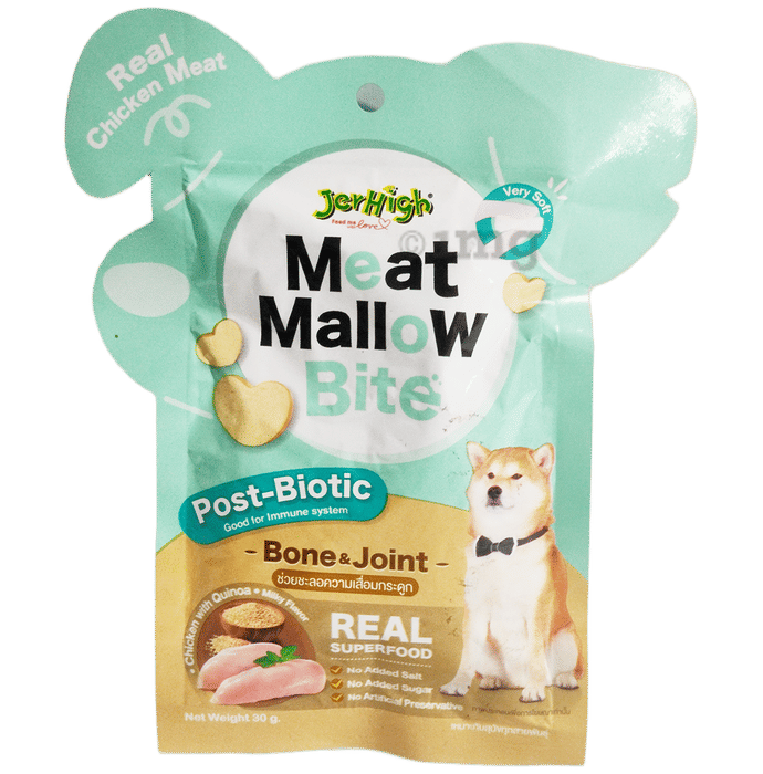 JerHigh Meat Mallow Bite (Bone and Joint) is made from chicken combined with superfood ingredients. It contains postbiotics that support the regulation of the immune system and also help maintain body balance. This bite-sized snack includes quinoa, collagen, and chondroitin sulfate, which can support bone and joint strength in dogs.