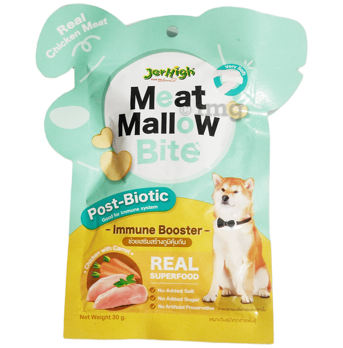 JerHigh Meat Mallow Bite / Immune Booster is made with chicken combined with carrot and formulated with superfood ingredients. It contains postbiotics and beta-glucan that support the balance of body functions. These bite-sized soft chews are designed to be easy to feed and enjoyable for dogs.