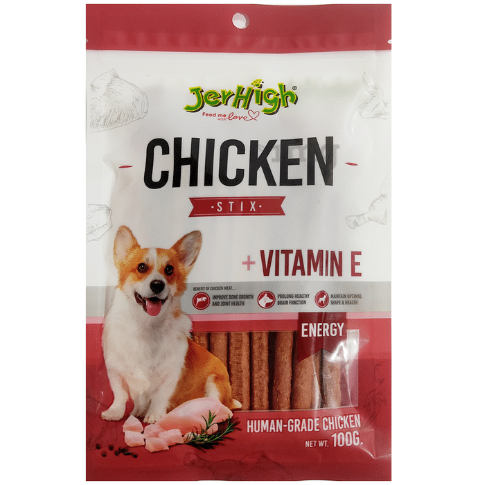 JerHigh Vitamin E Stix Chicken is a soft and chewable treat made from real chicken meat and enriched with Vitamin E. Designed to be a nourishing reward for dogs, this treat may help support antioxidant activity and assist in maintaining muscle health. Its digestible composition and balanced ingredients make it suitable as a snack during training or routine feeding.