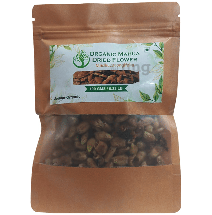 Jodnar Organic Mahua Dried Flower consists of sun-dried blossoms from the Madhuca longifolia tree. These flowers are valued for their naturally sweet flavour and rich nutritional profile, including essential vitamins, minerals, natural sugars, and phytonutrients. Mahua flowers are traditionally used in Indian cuisine for making beverages, desserts, and chutneys, and are also incorporated into wellness routines for their functional properties. The flowers are free from artificial additives or preservatives, offering a natural and versatile ingredient for culinary and dietary use.