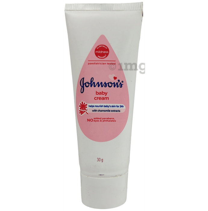 Johnson's Baby Cream is a baby cream formulated to nourish and protect a baby's delicate skin from dryness. It contains nourishing ingredients like glycerin, which help to moisturize and support healthy skin development. The cream is clinically proven to provide up to 24 hours of moisturization.