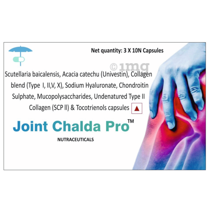 Joint Chalda Pro Capsule (10 Each) is a food supplement that contains a combination of plant extracts, bioactive compounds, and essential nutrients. Each capsule includes Undenatured Type II Collagen (UC-II®), Chondroitin Sulphate, Sodium Hyaluronate, Mucopolysaccharides, and a blend of Collagen Types I, II, III. It also contains botanical ingredients such as Boswellia serrata extract and Curcumin, along with Vitamin C, Vitamin D3, Vitamin E, and minerals including Zinc, Magnesium, Copper, Manganese, and Selenium. These nutrients may help support collagen formation, contribute to joint structure, and assist in maintaining overall bone and connective tissue health. The product is intended for adults and should be consumed under the supervision of a healthcare professional. It may be used as part of a daily routine to support joint wellness through dietary intake.