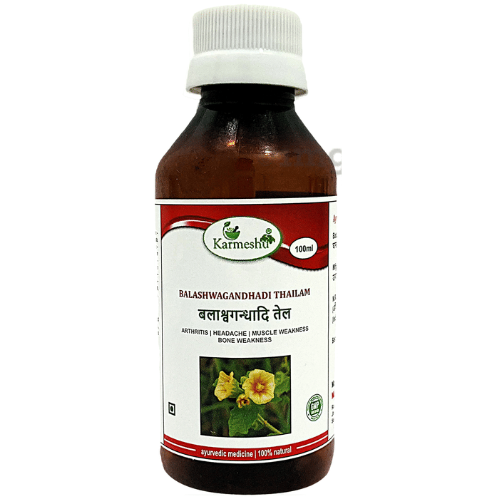 Karmeshu Balashwagandhadi Thailam is an ayurvedic massage oil. It can be used for its muscle-strengthening and rejuvenating properties. It may help relieve fatigue, weakness, and post-illness exhaustion, supporting overall vitality and wellness. Regular use may help maintain physical energy and support general well-being.
