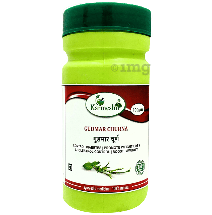 Karmeshu Gudmar Churna is also referred to as Meshashringi or Gymnema Sylvestre and is an ayurvedic herb that can be used to support sugar level and metabolic health. It may help regulate glucose absorption, manage sweet cravings, and assist in maintaining overall wellness through internal nutritional support.