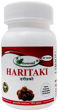Karmeshu Haritaki Tablet is a herbal formulation made with Haritaki (Terminalia chebula), which may help maintain digestive wellness and support regular bowel movements. It may assist in detoxifying the body, strengthening digestion, and managing mild gastrointestinal disturbances.