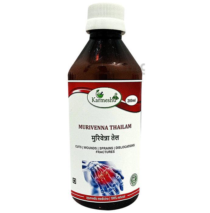 Karmeshu Murivenna Thailam is an ayurvedic oil that can be used for its wound-healing, anti-inflammatory, and pain-relieving properties. It can be used for muscle injuries, joint pain, bone health, sprains, and skin-related issues. This oil may help offer comfort in localised areas affected by physical impact or surface-level concerns and can be applied as part of external wellness routines.