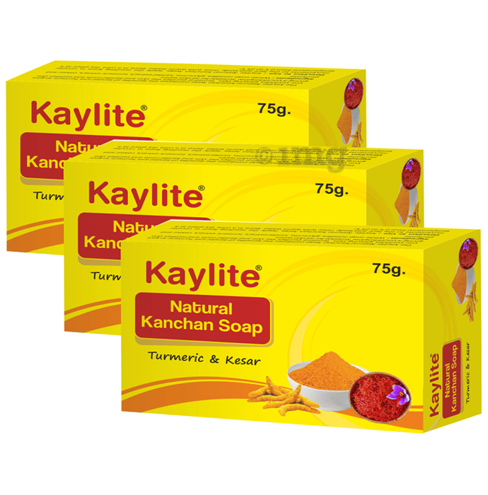 Kaylite Natural Kanchan Soap (75gm Each) Turmeric & Kesar combines the benefits of kesar and turmeric to give you youthful, glowing skin. Turmeric purifies the skin, while kesar cools and soothes, providing a radiant complexion suitable for all skin types.
