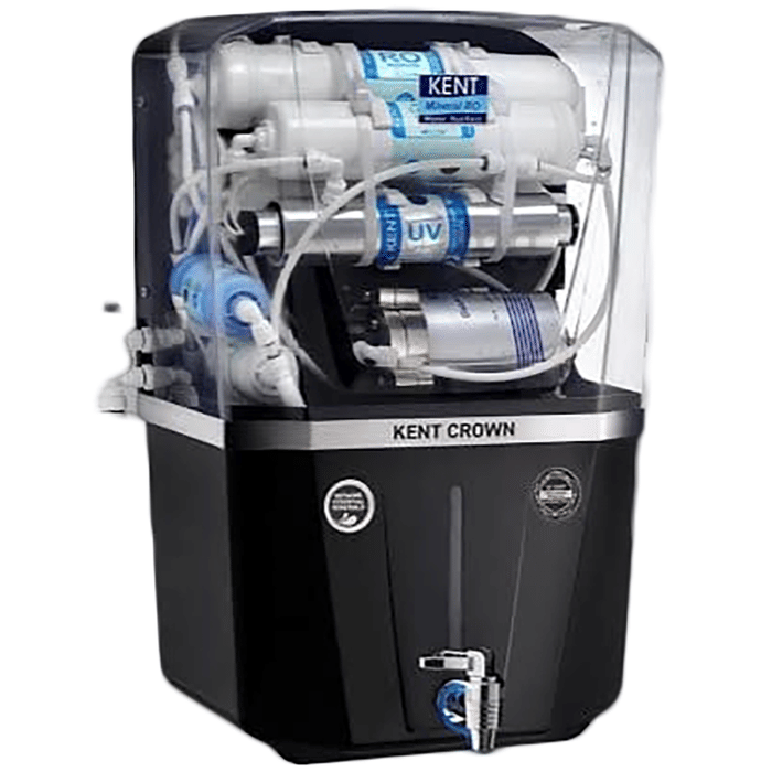 Kent Crown Plus RO Water Purifier 11L Black is a water purification system that uses multi-stage purification with RO+UV+UF+TDS Control+UV In-Tank to provide purified drinking water. The UV LED light in the storage tank maintains water quality, while Zero Water Wastage Technology™ recirculates rejected water to the overhead tank. This purifier is suitable for brackish, tap, and municipal corporation water supplies, making it adaptable for various settings. It has a purification capacity of up to 20L/hr and an 11L storage tank, supporting water availability. The wall-mounted black design complements modern interiors, while its user-friendly operation allow for ease of use.