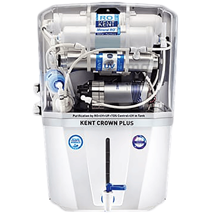 Kent Crown Plus-W RO Water Purifier 11L White is a water purification system designed to provide purified drinking water. Featuring a RO+UV+UF+TDS Control purification process, it reduces dissolved impurities, salts, and heavy metals while retaining essential minerals. The purifier includes Zero Water Wastage Technology™, which recirculates rejected water back to the overhead tank. With an 11-litre storage tank, in-tank UV disinfection, and a purification capacity of 20L/hr, it is designed for use in homes and offices. The fully automatic system operates with auto-on and auto-off functions for convenience. Constructed with ABS material, it is built for durability and corrosion resistance.