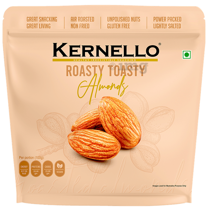 Kernello Roasty Toasty Almonds Vegan Kernello's Roasty Toasty Almonds are made with no added oil, to help preserve the inherent nutrition in the nuts. They are roasted, creating a blend of light salt and toasty flavour.