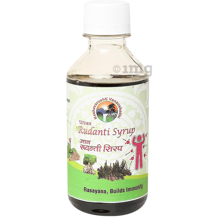 Keshavsrushti Vanaushadhi Uttan Rudanti Syrup is an excellent immunomodulator. It has anti-ageing properties. It primarily helps improve immunity and manages microbial infections. It exhibits anti-inflammatory action and decreases related symptoms like fever, pain, etc.