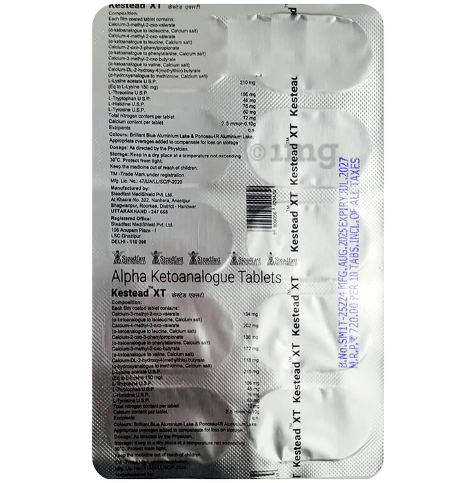 Kestead XT Tablet is a health supplement formulated with amino acids, partly in the form of their corresponding keto analogues for individuals with chronic kidney disease. The tablet offers double the strength of alpha-keto analogues which ensures the intake of essential amino acids and reduces the consequences of inadequate dietary protein intake.