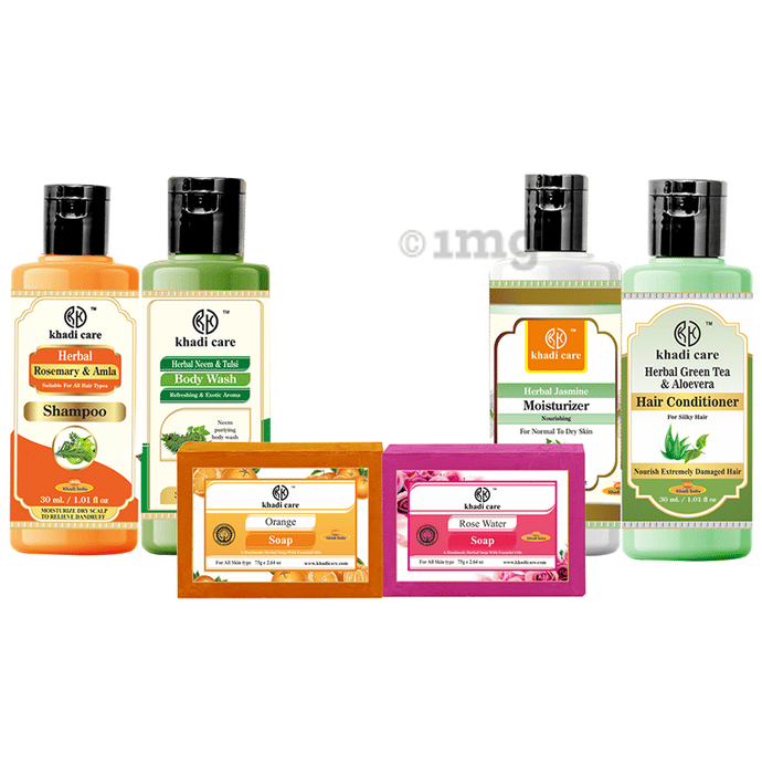 Khadi Care Travel Kit is a thoughtfully curated set of natural skin and hair care products designed for travellers. This kit includes a mix of herbal products, including shampoo, conditioner, body wash, moisturiser, and soaps, each enriched with natural ingredients like rosemary, amla, neem, tulsi, jasmine, and green tea. Crafted with Ayurvedic expertise, the travel kit promotes healthy skin and hair, leaving you refreshed and radiant even on the go.