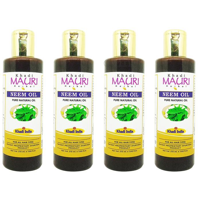 Khadi Mauri Herbal Neem Oil (210ml Each) is an effective formula for damaged skin and hair. It controls dandruff acne breakouts, skin and scalp infections and also maintains natural scalp pH. It nourishes hair follicles and is antibacterial in nature. It nourishes the skin and helps fade dark spots, and pigmentation.