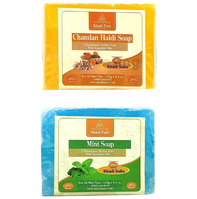 Khadi Pure Combo Pack of Chandan Haldi Soap and Mint Soap Khadi Pure Chandan Haldi Soap is a bathing bar that protects from bacteria. It gives freshness and coolness to the body.