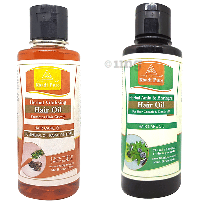 Khadi Pure Combo Pack of Herbal Amla and Bhringraj Hair Oil and Herbal Vitalising Hair Oil Khadi pure herbal amla and bhringraj hair oil prevents and stops the greying of hair and dandruff. Enriched with bhringraj and reetha, it is an excellent hair tonic and cleanses hair naturally. Provides relief from the itchy scalp and has antiseptic and antibacterial properties.