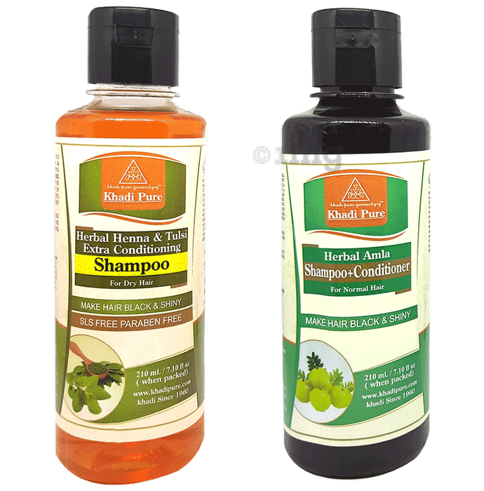 Information about Khadi Pure Combo Pack of Herbal Amla Shampoo + Conditioner & Herbal Heena & Tulsi Extra Conditioning Shampoo SLS & Paraben Free (210ml Each)