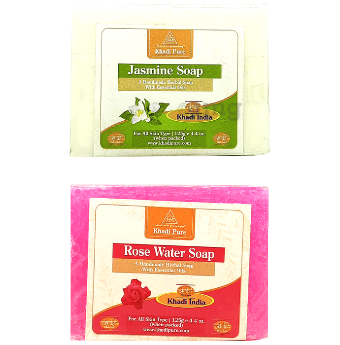 Khadi Pure Combo Pack of Jasmine Soap & Rose Water Soap (125gm Each) Khadi Pure Jasmine Soap is a handmade herbal soap with essential oils suitable for skin care and cleansing. It is a gentle cleansing soap with the wonderful scent of the jasmine flower. The well known properties of jasmine are suitable for all skin types-dry, oily or sensitive. It has a pleasant fragrance that can be soothing. It clarifies and hydrates for softer skin. This soap is suitable for all skin types. Khadi Pure Rose Water Soap is a unique recipe using rose petals water and glycerine Khadis rosewater soap imparts mild antiseptic properties while keeping skin smooth and velvety.