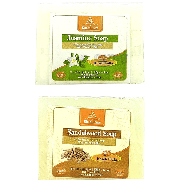 Khadi Pure Combo Pack of Jasmine Soap & Sandalwood Soap (125gm Each) Khadi Pure Jasmine Soap is a handmade herbal soap with essential oils beneficial for skin diseases, itching, and rashes. It is a gentle cleansing soap with the wonderful scent of the jasmine flower. The well known therapeutic properties of jasmine are beneficial for all skin types-dry, oily or sensitive. It soothes the mind and body. Jasmine helps alleviate aches and pains. It clarifies and hydrates for softer skin. This soap helps heal blemishes and scars. It is suitable for all skin types. Khadi Pure Sandalwood Soap is a handmade herbal soap with essential oils beneficial for bathing in warm and fragrant skin. The soap has immense healing properties. Its cooling, calming and antiseptic properties soothe skin leaving it moisturised and free of infections.
