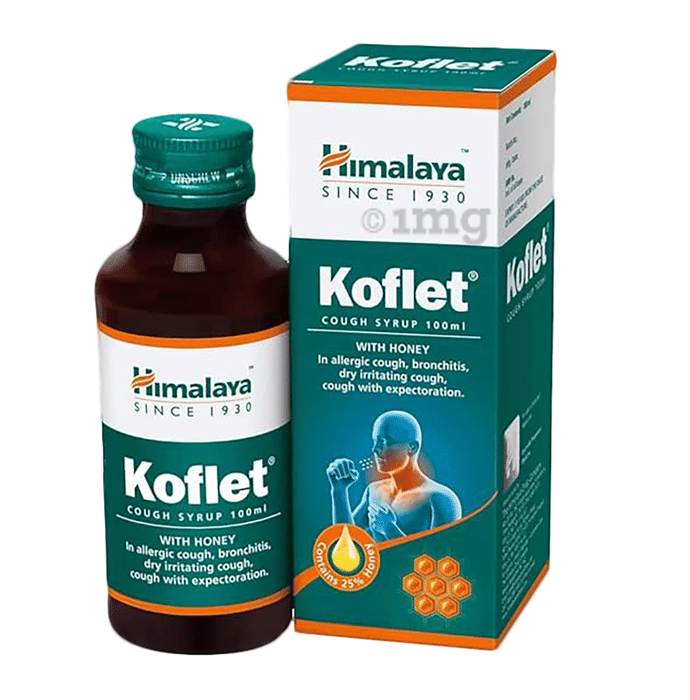 Himalaya Koflet Syrup contains tulasi, madhu and yashtimadhu. Koflet can help in managing both productive and dry cough. The mucolytic and expectorant properties may reduce the viscosity of bronchial secretions and facilitate expectoration. Koflet’s peripheral antitussive (cough suppressant) action may reduce bronchial mucosal irritation and related bronchospasms. In addition, the anti-allergic, antimicrobial and immune-modifying properties can provide relief from cough. The demulcent action of Koflet syrup may soothe respiratory passages.
