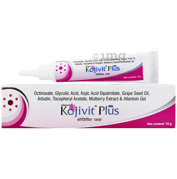 Kojivit Plus Gel is a depigmenting medicine that is used to manage skin conditions such as melasma (dark brown hyperpigmentation), periorbital melanosis, and hyperpigmentation. It contains a combination of active ingredients including kojic acid dipalmitate, arbutin, mulberry extract, grape seed extract, allantoin, glycolic acid, vitamin E, and octinoxate, which work together to reduce skin pigmentation and promote skin lightening.