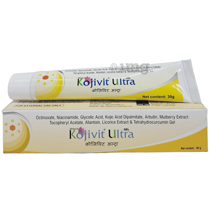 Kojivit Ultra Gel is a skincare gel which can help reduce brown patchy discolouration of the skin and hyperpigmentation. The gel contains octinoxate, niacinamide, glycolic acid, kojic acid, arbutin, mulberry extract, vitamin E, and curcumin as the key ingredients, which are potent skin-brightening agents. The gel can help enhance your regular derma care routine.