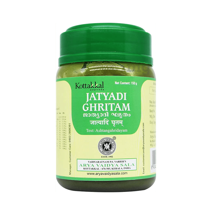 Kottakkal Ayurveda Jatyadi Ghritam is a classical Ayurvedic formulation prepared as per the Ashtangahridayam text. It is commonly used in traditional practice for skin and wound care, leveraging the properties of its ghrita (ghee) base and a blend of herbal ingredients.