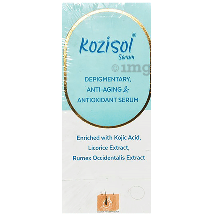 Kozisol Serum is enriched with Kojic acid, licorice extract, and Rumex Occidentalis extract that lightens the skin and improves the appearance of age spots and sun damage. The reduction of dark spots can have an anti-aging effect, reduce the discoloration of scars, and give skin a radiant glow. It minimizes skin pores and boosts skin clarity and smoothness.