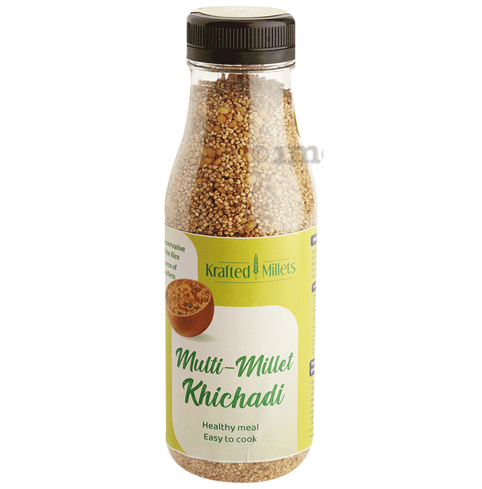 Krafted Millets Multi-Millet Kichadi is a nutritious and flavorful dish made with millets. Millets, including Bajra (Pearl Millet), contain 100% more dietary fibre than white rice. Bajra Khichdi (Pearl Millet Khichdi) is high in fibre and gets digested slowly. The insoluble fibre content in Bajra acts as a prebiotic that supports digestive health. The insoluble fibre also improves bowel movement, supporting digestive regularity. Bajra Khichdi (Pearl Millet Khichdi) is a complex carbohydrate that is slowly absorbed by the body. As a result, you feel satiated and are less likely to overeat.