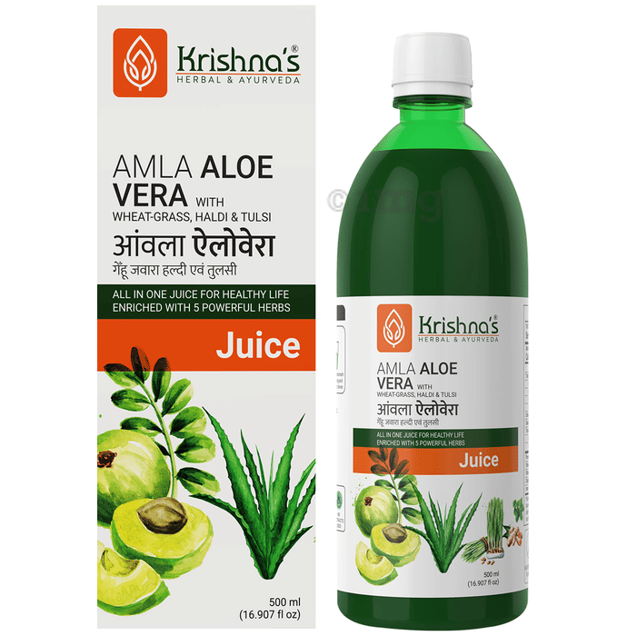 Krishnas Amla Aloe Vera with Wheat Grass, Haldi, and Tulsi Juice is a herbal juice with multiple natural ingredients.