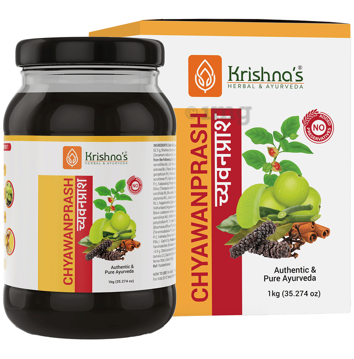 Krishnas Herbal & Ayurveda Chyawanprash is a combination of 55 raw herbs which promote general wellness. It provides strength, energy and improves your bodys immunity system. It aids in purifying blood and helps in proper digestion, thus eliminating toxins from your body. It is packed with vitamin C because of the presence of amla and has a high anti-oxidant value. It is beneficial for all age groups, especially children, as it is loaded with 55 herbs and minerals supporting your overall health and keeping you active all through the year.