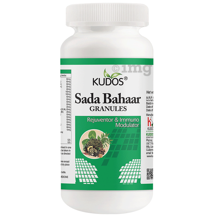Kudos Sada Bahaar Granules is an Ayurvedic formulation crafted with a blend of herbs like Triphala, Brahmi, Giloy, Vidari, and Dashmool, that can help support internal detoxification and energy, manage stress, and improve digestive health. Processed through triple Bhavana and fortified with a natural Sharkara base, this formulation offers comprehensive wellness support. Ideal for individuals seeking to help improve metabolic function and vitality naturally and holistically.