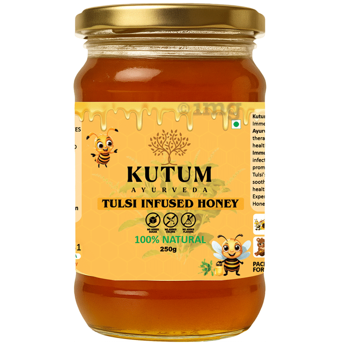 Kutum Ayurveda Honey Tulsi Infused is rich in natural antioxidants and nutrients, it may help provide quick energy, support digestive comfort, contribute to soothing the throat, and assist in overall well-being. With its delicate sweetness, it can also be used as a natural alternative to refined sugar in foods and beverages.