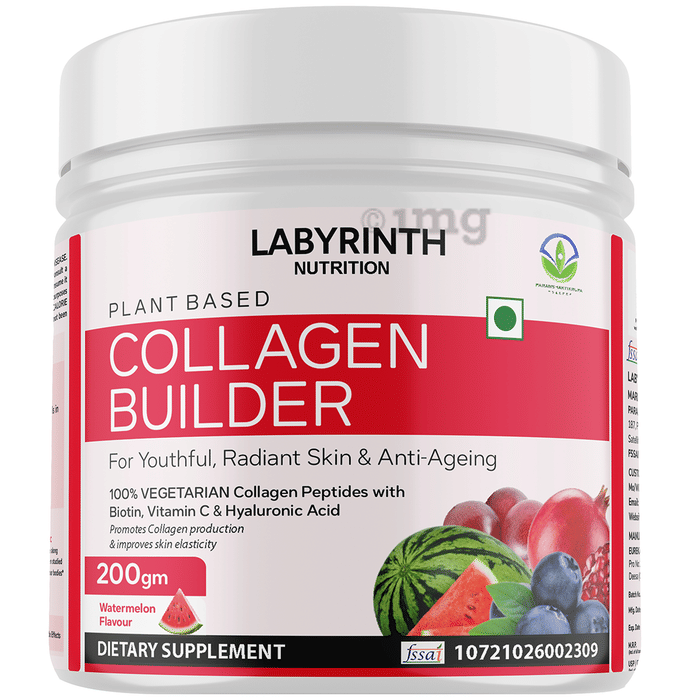 Labyrinth Collagen Builder Powder Watermelon is a blend of plant-derived ingredients including watermelon fruit powder, hyaluronic acid, biotin, and vitamin C. Designed for those seeking to help support their skin’s natural appearance, this supplement combines amino acids and botanical extracts such as blueberry, sea buckthorn, and acerola cherry. It is available in an easy-to-mix powder form with a fruity taste that suits daily routines. This vegetarian formula provides a convenient approach for individuals exploring collagen support.