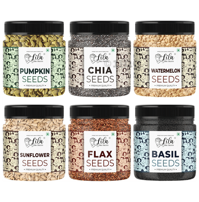 Lila Dry Fruits Combo Pack of Basil, Chia, Sunflower, Watermelon, Pumpkin and Flax Seeds comes with 6 seeds combo, a powerhouse blend of nutrient-rich seeds carefully curated to elevate your daily nutrition. This combo includes basil, chia, sunflower, watermelon, pumpkin, and flax seeds, offering a diverse range of health benefits in one convenient package. Basil seeds, also known as Sabja seeds, are a good source of dietary fibre and are known for their cooling properties, making them a popular choice during hot weather. Chia seeds are a good source of omega-3 fatty acids and antioxidants, supporting heart health and overall well-being. Sunflower seeds provide a good source of vitamin E and minerals, supporting healthy skin and immune function. Watermelon seeds provide protein and essential nutrients, contributing to muscle health and energy levels. Pumpkin seeds are a good source of protein, healthy fats, and various vitamins and minerals, supporting overall health and well-being. Flax seeds are a good source of omega-3 fatty acids and dietary fibre, supporting digestion and providing a feeling of fullness. Enjoy the versatility of 6 Seeds Combo by incorporating them into your favourite recipes. Sprinkle them over salads, yoghurt, or oatmeal for added texture and nutrition. Blend them into smoothies for a nutrient-packed boost or use them as a topping for baked goods. Packed with essential nutrients and free from additives and preservatives, Lila Dry Fruites 6 seeds combo is the perfect choice for anyone looking to enhance their diet with wholesome ingredients.