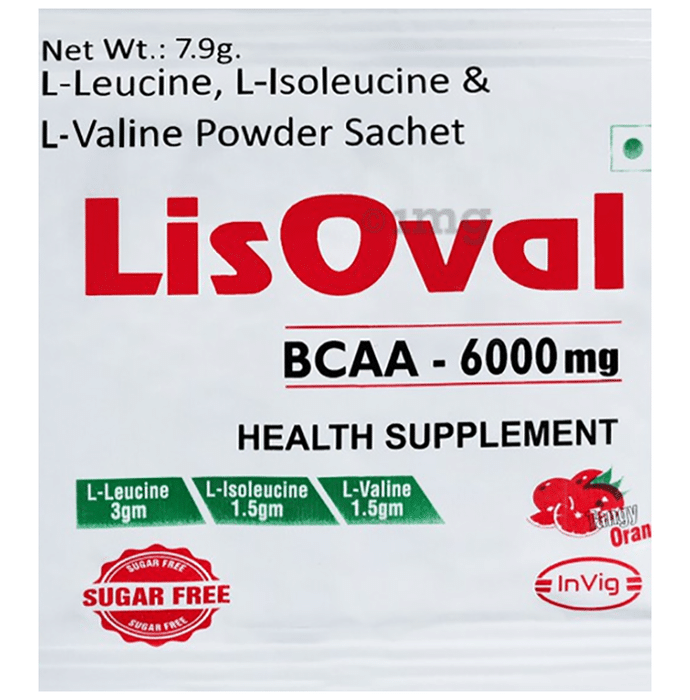 Lisoval BCAA 6000 mg Sachet Tangy Orange Sugar Free is a specialized formulation containing branched-chain amino acids, including l-leucine, l-isoleucine, and l-valine. This potent blend is designed to support muscle maintenance and promote essential protein synthesis.
