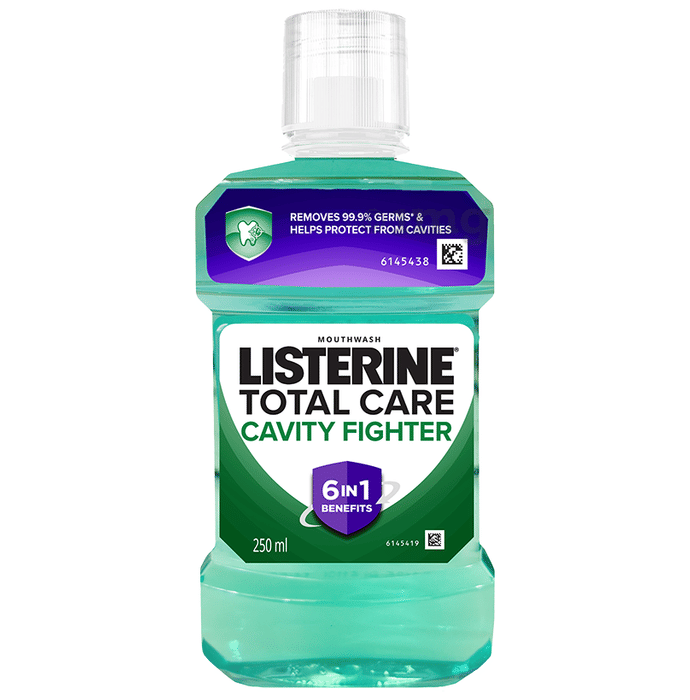 Listerine Cavity Fighter Mouthwash is a cavity-fighting mouthwash that is intended to help prevent tooth cavities while fighting germs that cause bad breath, plaque, and gum problems. The mouthwash formula contains fluoride, which helps to build a protective layer on teeth to make them resistant to decay. Additionally, the mouthwash contains four essential oils (menthol, thymol, eucalyptol and methyl salicylate), which may assist in reducing gum problems and bad breath.