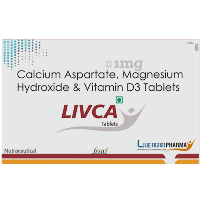 LIVCA Tablets are a combination of Calcium Aspartate, Magnesium Hydroxide, and Vitamin D3 designed to support nutritional wellbeing. Marketed by Live Again Pharma, these tablets help to supplement essential minerals and vitamins. They come as film-coated tablets for easy consumption and nutritional support.